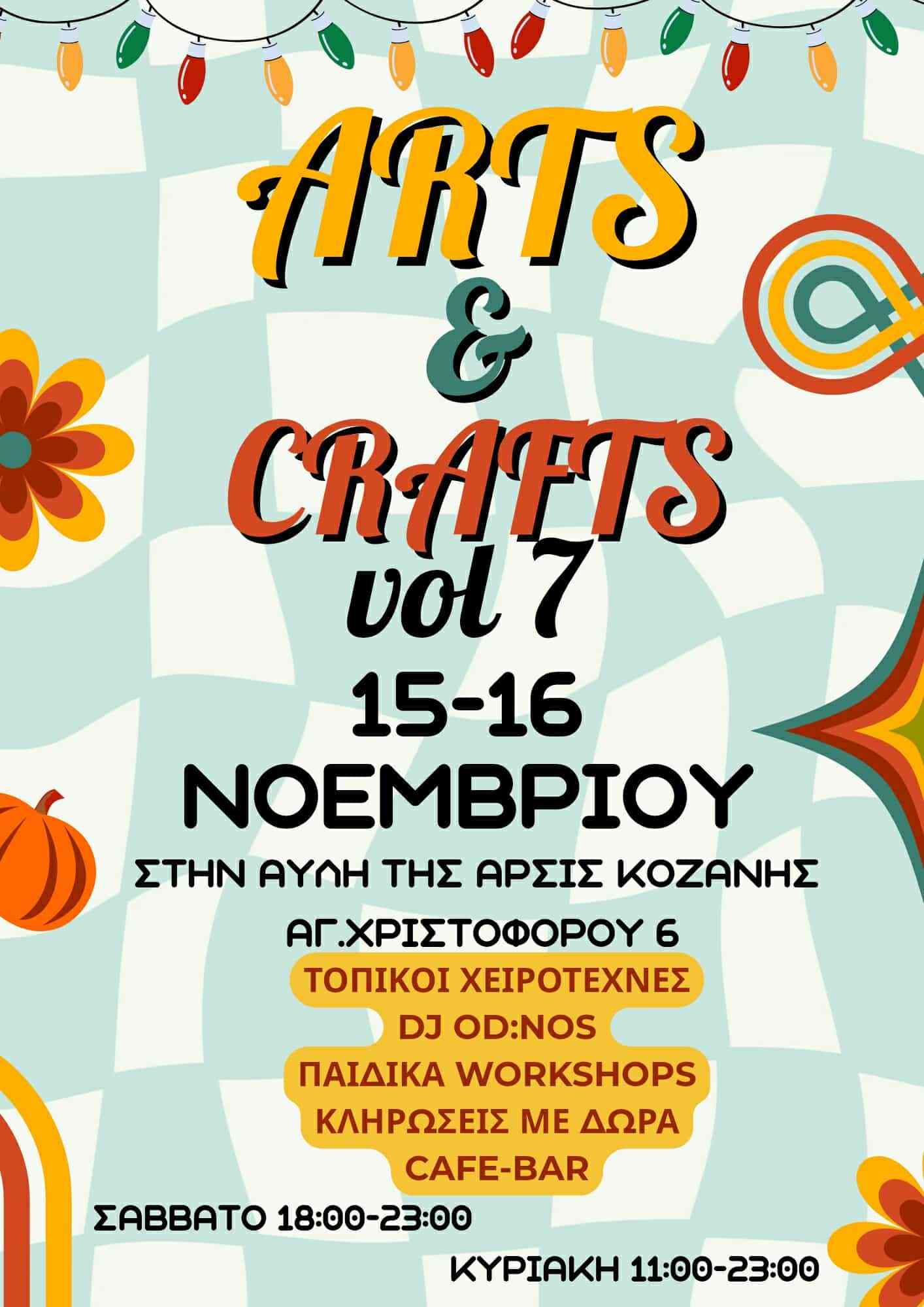 Οι χειροτέχνες του Arts & Crafts Festival σας καλούν το Σάββατο 15 Νοεμβρίου (18:00–23:00) και την Κυριακή 16 Νοεμβρίου (11:00–23:00) στην αυλή του σπιτιού της ΑΡΣΙΣ Κοζάνης (Αγ. Χριστοφόρου 6), στο 7ο Arts & Crafts Festival | Χειροτεχνία – Δημιουργία.