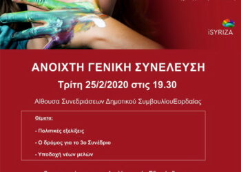 Read moreΣΥΡΙΖΑ ΟΜ Εορδαίας: Ανοιχτή Γενική Συνέλευση την Τρίτη 25 Φεβρουαρίου 2020, στις 19:30, στην Αίθουσα Συνεδριάσεων του Δημοτικού Συμβουλίου Εορδαίας.