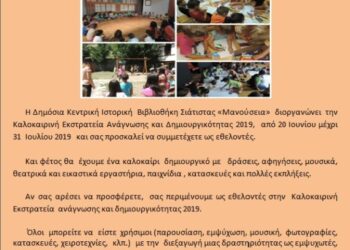 Η Δημόσια Κεντρική Ιστορική Βιβλιοθήκη Σιάτιστας Μανούσεια διοργανώνει την Καλοκαιρινή εκστρατεία Ανάγνωσης και Δημιουργικότητας 2019 από 20 Ιουνίου μέχρι 31...