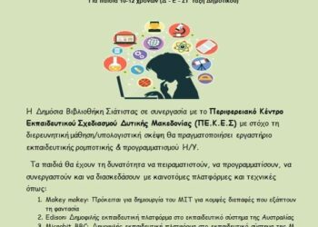 ΣΙΑΤΙΣΤΑ Βιβλιοθήκη Σιάτιστας: Εκπαιδευτική δράση για τη ρομποτική by sierafm 23 Ιανουαρίου 2020 0 Εκπαιδευτική δράση για τη ρομποτική θα πραγματοποιηθεί στη βιβλιοθήκη Σιάτιστας την Πέμπτη 30 Ιανουαρίου από τις 5 μέχρι τις 7... Read more