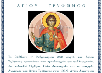 ΣΙΑΤΙΣΤΑ Ενορία Αγίου Δημητρίου: Θείες λειτουργίες για τον Άγιο Τρύφωνα και της Υπαπαντής του Κυρίου by sierafm 27 Ιανουαρίου 2020 0 Θείες λειτουργίες για τον Άγιο Τρύφωνα και της Υπαπαντής του Κυρίου θα πραγματοποιηθούν στην Ενορία Αγίου Δημητρίου Σιάτιστας Read more