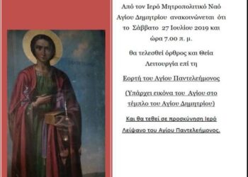 Read moreΑπό τον Ιερό Μητροπολιτικό Ναό Αγίου Δημητρίου ανακοινώνεται ότι το Σάββατο 27 Ιουλίου 2019 και ώρα 7.00 π.μ. θα τελεσθεί...