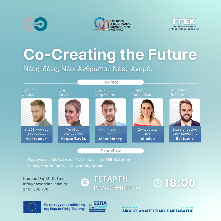 Ο Συνεργατικός Χώρος Εργασίας Δυτικής Μακεδονίας, σε συνεργασία με το Επιμελητήριο Κοζάνης, διοργανώνει την εκδήλωση «Co-Creating the Future: Νέες Ιδέες, Νέοι Άνθρωποι, Νέες Αγορές», μια ανοιχτή συζήτηση με νέους επιχειρηματίες της περιοχής που εκπροσωπούν τη νέα γενιά του τοπικού επιχειρηματικού οικοσυστήματος.