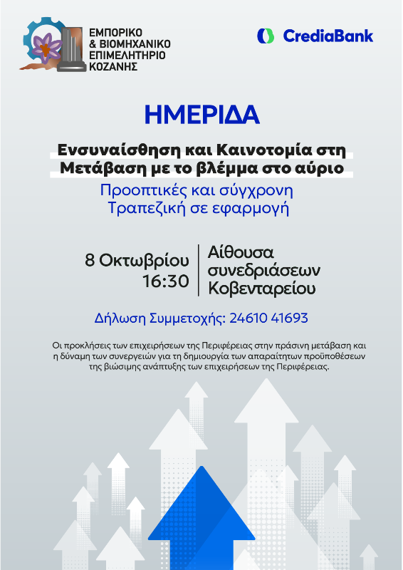 Η CrediaBank, στο πλαίσιο της δέσμευσης της στη βιώσιμη επιχειρηματικότητα, στηρίζει την Ημερίδα που διοργανώνει το Εμπορικό & Βιομηχανικό Επιμελητήριο Κοζάνης, με θέμα «Ενσυναίσθηση και Καινοτομία στη Μετάβαση με το βλέμμα στο αύριο: Προοπτικές και σύγχρονη Τραπεζική σε εφαρμογή», την Τετάρτη 8 Οκτωβρίου, στις 16:30, στην Αίθουσα Συνεδριάσεων του Δημοτικού Συμβουλίου Κοζάνης στο «Κοβεντάρειο» κτίριο (Μούκα 1-7, Κοζάνη).