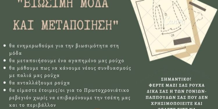 «Εν όψει των εορτών η ομάδα μας διοργανώνει ένα βιωματικό εργαστήρι ενημέρωσης για την πολυσυζητημένη «βιώσιμη μόδα» συνδυασμένη με διαδραστική δραστηριότητα μεταποίησης χρησιμοποιημένων ρούχων μας, καθώς και ανάδειξη διαφόρων νέων τρόπων για να τα συνδυάσουμε χωρίς να χρειαστεί να αγοράσουμε νέα!