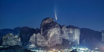 Η φωτογραφία του κομήτη Neowise να διαγράφει τη φωτεινή του πορεία, με φόντο τα Μετέωρα, τραβήχτηκε στις 12 Ιουλίου 2020.