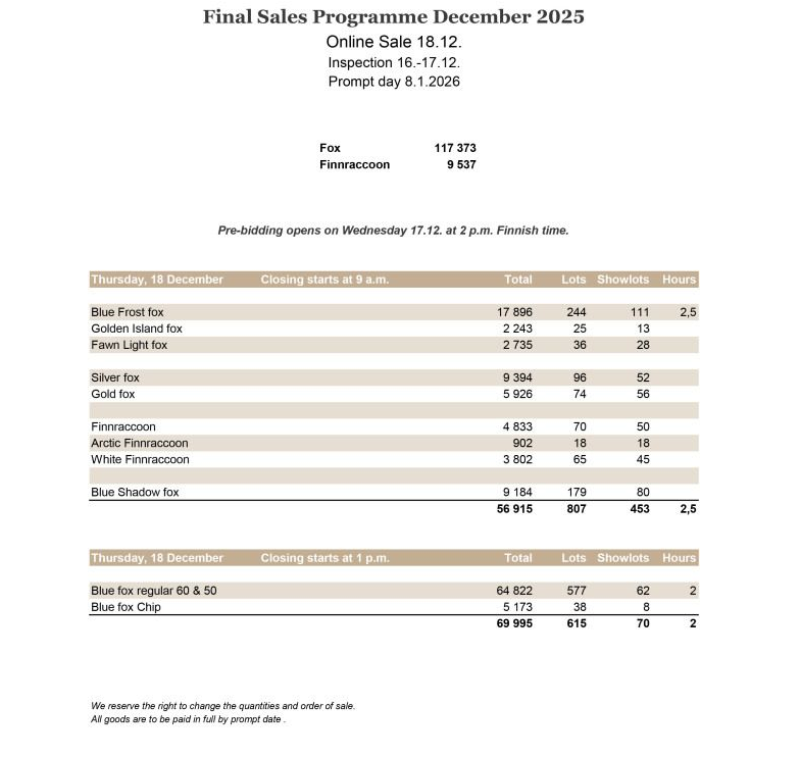 Η διαδικτυακή πώληση θα πραγματοποιηθεί την Πέμπτη 18 Δεκεμβρίου, ενώ η επιθεώρηση θα οργανωθεί στις 16–17 Δεκεμβρίου. Η προσφορά θα περιλαμβάνει 117.000 αλεπούδες και 9.500 Finnraccoons.