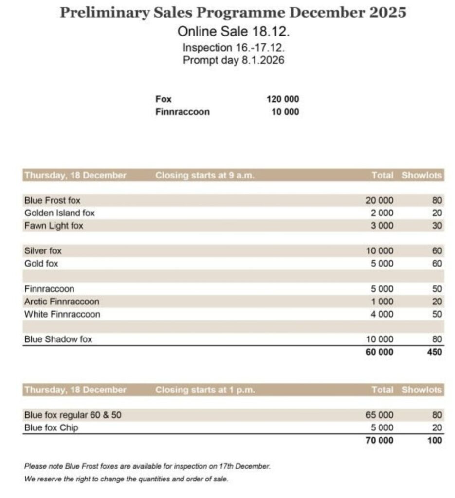 Η διαδικτυακή πώληση της Saga Furs θα πραγματοποιηθεί την Πέμπτη, 18 Δεκεμβρίου 2025. Θα προσφερθεί μια συλλογή από 120.000 αλεπούδες και 10.000 Finnraccoon. Η προσφορά περιλαμβάνει 70.000 δέρματα Blue Fox και ολοκληρώνεται με δέρματα Blue Shadow, Blue Frost, Golden Island, Fawn Light, Silver Fox, Gold Fox και Finnraccoon. Η επιθεώρηση θα πραγματοποιηθεί στις 16-17 Δεκεμβρίου.