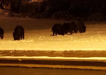 Βόλτα στο νυχτερινό, χιονισμένο τοπίο, στο Πανόραμα Θεσσαλονίκης, έκανε ένα κοπάδι από αγριογούρουνα, εκπλήσσοντας το βράδυ του Σαββάτου περίοικους, αλλά ...