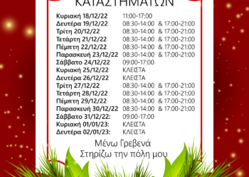 Το εορταστικό ωραρίου λειτουργίας των καταστημάτων για την πόλη των Γρεβενών είναι το ακόλουθο. Κυριακή 18/12/22: 11:00-17:00 Δευτέρα 19/12/22: 08:30-14:00 ...