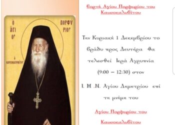 Ενορία Αγίου Δημητρίου Σιάτιστας: Αγρυπνία για τον Άγιο Πορφύριο by sierafm 27 Νοεμβρίου 2019 0 Αγρυπνία για τον Άγιο Πορφύριο θα πραγματοποιηθεί στονΆγιο Δημήτριο Σιάτιστας