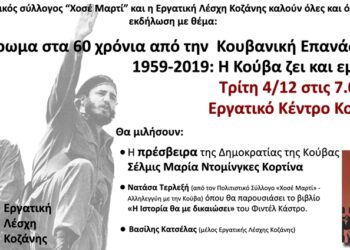 Αφιέρωμα στα 60 χρόνια από την κουβανική Επανάσταση με την παρουσία της πρέσβειρας της δημοκρατίας της Κούβας by sierafm 23 Νοεμβρίου 2018 0 Η Εργατική Λέσχη Κοζάνης μαζί με τον πολιτιστικό σύλλογο "Χοσέ Μαρτί - αλληλεγγύη με την Κούβα" διοργανώνουν την Τρίτη 4/12 ...