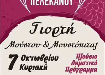 Γιορτή Μούστου και μουστόπιτας στον Πελεκάνο by sierafm 1 Οκτωβρίου 2018 0 Γιορτή Μούστου και μουστόπιτας στον Πελεκάνο την Κυριακή 7 Οκτωβρίου