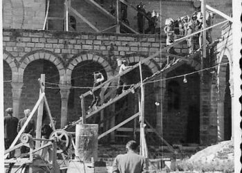 Ανέγερση τρούλου Αγίου Δημητρίου Σιατίστης 1955 με προσωπική εργασία των Σιατιστινών. Η σπάνια φωτογραφία είναι του Σάκη Σπύρου. Περίτεχνη σκαλωσιά ...