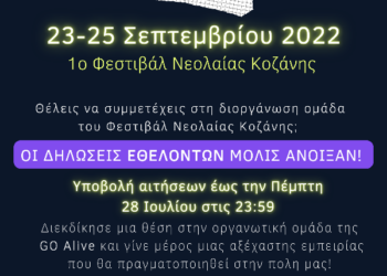 O οργανισμός νεολαίας “GO Alive” διοργανώνει το 1ο Φεστιβάλ Νεολαίας στην πόλη της Κοζάνης by sierafm 15 Ιουλίου 2022 0 O οργανισμός νεολαίας “GO Alive” διοργανώνει το 1ο Φεστιβάλ Νεολαίας στην πόλη της Κοζάνης (23-25 Σεπτεμβρίου 2022), στο πλαίσιο του ...