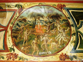 Οι τοιχογραφίες του ομορφαίνουν ακόμα και τις εσωτερικές κατακόρυφες επιφάνειες των ανοιγμάτων. Ο μύθος του Περσέα που σκοτώνει τις Γοργόνες, των Μοιρών, του Οιδίποδα και της Σφίγγας, του τραγοπόδαρου Πάνα, του Ασκληπιού, της θεάς Άρτεμης, του θεού Ηφαίστου στο εργαστήριο του, του θεού Απόλλωνα, του Βελλεροφόντη που σκοτώνει την Χίμαιρα, του Ηρακλή και της Λερναία Ύδρα, του Ηρακλή και των Μήλων των Εσπερίδων, του Απόλλωνα που διασκεδάζει με την θεϊκή μουσική του τις Εννιά Μούσες, του Θεού Διόνυσου με του Σάτυρους και τα Μαινάδες να πρωταγωνιστούν σε ένα ακόμα Δυονυσιακό Όργιο, του Οδυσσέα που περνάει με το πλοίο του από την Σκύλα, του Οδυσσέα και των Σειρήνων, της γέννησης του θεού Δία, του θεού Ερμή, της θεάς Αφροδίτης, του Κρόνου του πατέρα των Θεών, του Αίολου του θεού των ανέμων, της γέννησης της θεάς Αθηνάς και πολλά άλλα θέματα. Η ελληνική μυθολογία απλώνεται μέσα στο δωμάτιο.